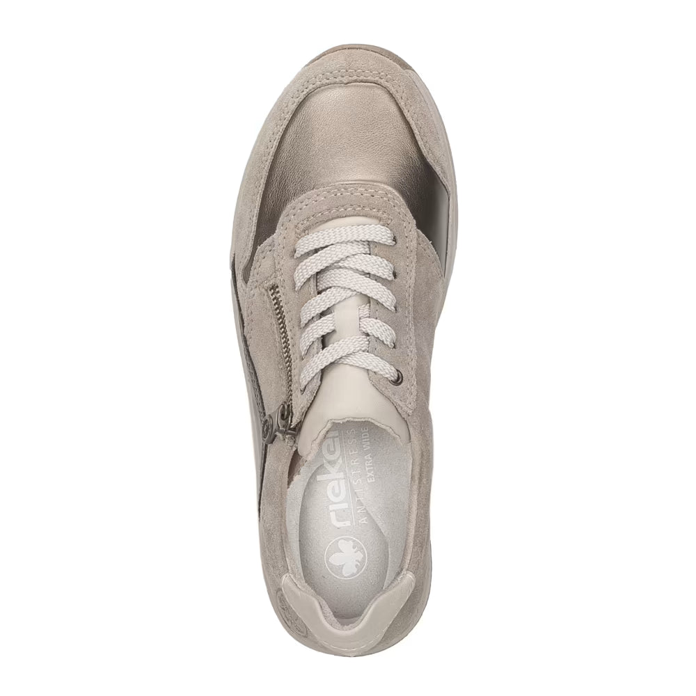 Step out in style with the Rieker Danielle N8114 sneaker, designed for women who love a trendy look without sacrificing comfort. Featuring a clever mix of materials with subtle shine and a discreet logo, these sneakers catch the eye softly. The combination of laces and a handy zipper lets you slip them on easily and get the perfect fit. Inside, a soft, shaped, removable insole keeps your feet happy all day, while the higher, stable sole absorbs shocks and keeps you confidently on the move. Perfect for busy days or casual outings, these shoes bring playful style and lasting comfort together.