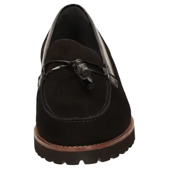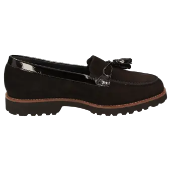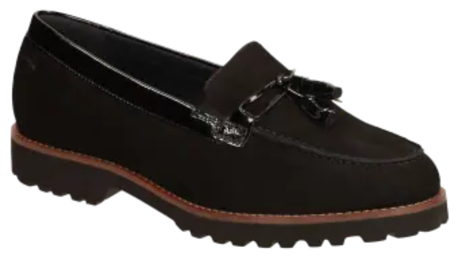 Women's college style-looking slip-on in a broad H width featuring an on-trend tassel trimming. Made of fine suede (lambskin) with waulked patent leather, the shoe is leather-lined and features stretchy fabric lining in the forefoot. These are bunion-friendly shoes. Removable, leather-covered insole with soft cushioning - can be replaced with a bespoke insole. Lightweight rubber sole featuring a rugged profile and a striking leather welt.